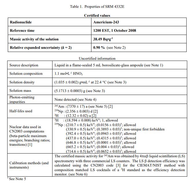 在 2008 年 10 月 1 日美國東部標準時間 1200 的參考時間,經認證的 Americium-243 質量活度值為:(38.49 ± 0.35) Bq?g-1